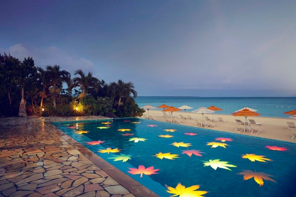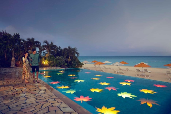秋は木々の葉が色付き、紅葉を楽しめる季節です。当ホテルで、秋らしい体験を満喫していただきたく、ビーチサイドで紅葉狩り気分を味わえる、本イベントを考えました。ビーチサイドにあるプールには、紅葉の形をした色鮮やかな「紅葉ライト」が浮かび、プールの目の前のビーチにはオレンジ色のパラソルが並びます。プールからビーチまで紅葉カラーを眺められるため、その様子を「紅葉インフィニティ」と名付けました。南の島の静かな環境で、波の音に耳を傾けながら、秋色に染まるビーチサイドでのんびりと過ごせます。