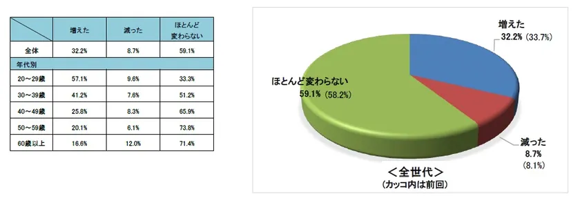 3年に及んだコロナ禍での自転車利用は、回答者全体では「ほとんど変わらない」(全体平均:59.1%)との回答結果でしたが、ここでも年代別で顕著に現れたのが、20代で「増えた」が57.1%、30代では41.2%と、「増えた」の全体平均(32.2%)との比較において比率が高い回答結果となっています。
