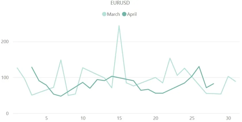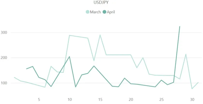 ドル円(USD/JPY)の3月と4月のボラティリティ推移を比較した上記グラフから、4月は3月に比べて全体的なボラティリティの鈍化傾向が見られました。1日当たりの平均ボラティリティは4月が127.7pipsと、3月の165.1pipsに比べ約37pips減少しています。ただし、4月のドル円は28日に323.3pipsという最大値を記録し、3月の最大ボラティリティ289.9pipsと比べて約33pips上昇しました。同日は日銀総裁による会見および金利決定が行われ、日銀の新リーダーである植田総裁の政策は「大規模な金融緩和の維持」に決定しました。日本市場の流動性を高め経済活動を促進するという、これまでの金融政策の継続が決定し、円安が進む結果となっています。