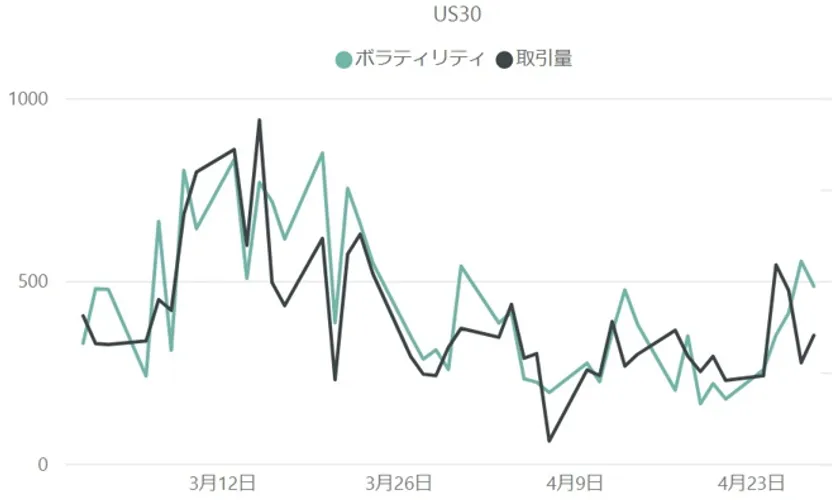 上記は3月・4月を対象にしたダウ平均株価(US30)の取引量とボラティリティ推移を示したグラフです。取引量の推移とボラティリティの推移は、おおむね相関しているものの若干のズレが生じていました。例えば、1日当たりの最大ボラティリティを記録した4月27日ですが、取引量の最大値はそれよりも先につけています。これは、25日・26日に立て続けに発表された米国の経済指標が、取引量増加の要因となったと考えられます。