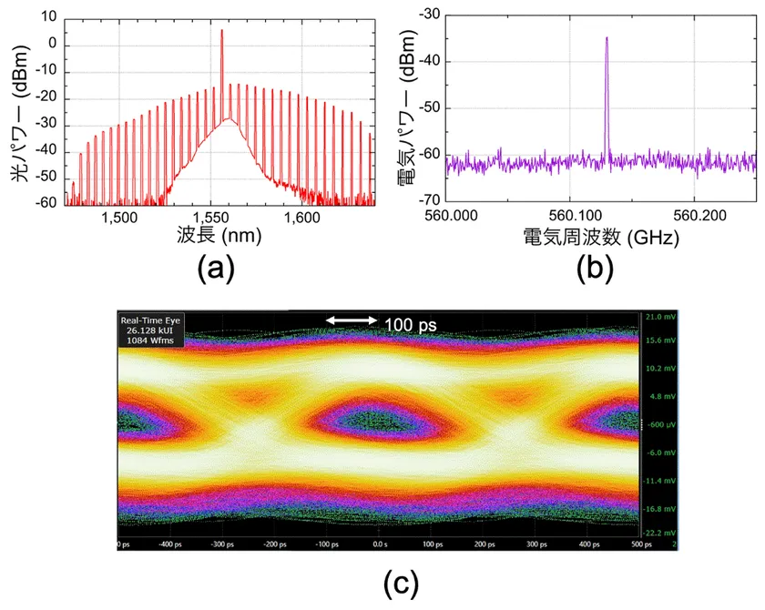 図3(a)は、マイクロ光コムを用いて生成した超高周波光電気周波数信号の光スペクトルを示しており、近赤外の波長1550nm帯においてモード間隔560GHzで複数の光モード列が立ち並んでいる様子が確認できます。ここで、マイクロ光コムの個々のモード列の周波数間隔は一定であり、かつ位相も完全に同期しています。図3(b)は、発生したテラヘルツ波のスペクトルを示しており、その周波数はマイクロ光コムのモード間隔と厳密に一致しています。次に、OOK振幅変調されたテラヘルツ波を、空間伝播させた後、テラヘルツ検出器で受信することにより、データ伝送実験を行いました。図3(c)は、受信した信号の時間波形(アイ・パターン)を示しており、時間波形信号の中央部分にeye状の空間が観測できることから、データ伝送実験に成功したことを確認しました。