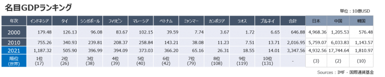 多くの国々が高い経済成長率を記録しており、ASEAN地域合計では2000年から2021年までの約20年間で、名目GDPが5倍以上に増加しています。