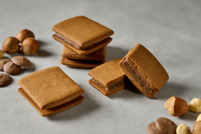 カカオの風味が香ばしいキャラメルサブレでサンドしました。