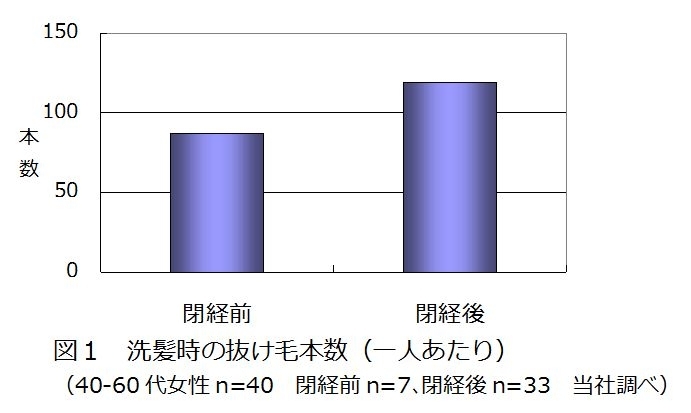 この度、40-60代の薄毛が気になる女性を対象に、洗髪時の抜け毛について分析した結果、閉経後の女性は抜け毛が多くなる傾向があることから(図1)、閉経後の女性ホルモンの減少が女性の毛髪に何らかの影響を与えることを再確認しました。