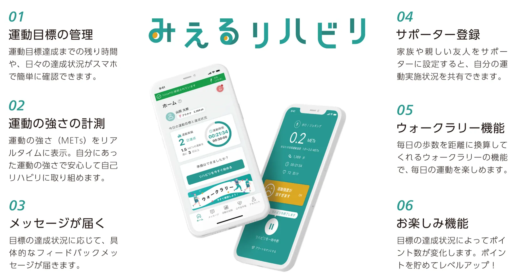スマートフォンアプリ「みえるリハビリ」では、1週間の運動目標時間を設定し、目標達成状況に応じたフィードバックメッセージの送信、ポイント/レベルシステムやウォークラリーといったお楽しみ要素、知人・家族などのサポータ登録といった行動経済学を基にした行動変容を促す仕組みを採り入れており、参加者が運動継続することをサポートします。