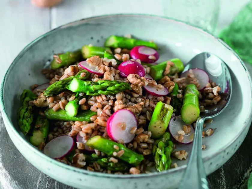 アスパラ、ラディッシュ、くるみのスペルト小麦サラダ