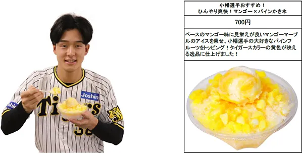 小幡選手コメント「マンゴー味のかき氷とマンゴーマーブルのアイス、そして僕の大好きなパインフルーツとの食べ合わせが最高です。たくさん食べて、ひんやり爽快な気分を味わってもらえたら嬉しいです。ぜひ食べてください!」