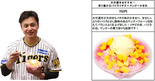 大竹選手コメント「自分自身が幼い頃によくかき氷を食べていたので、特にお子様に食べてもらいたいです。かき氷もフルーツもぎっしり詰まっているので、ボリューム満点だと思います。僕のかき氷を食べたいと思ってもらえるようにピッチングも頑張ります!」