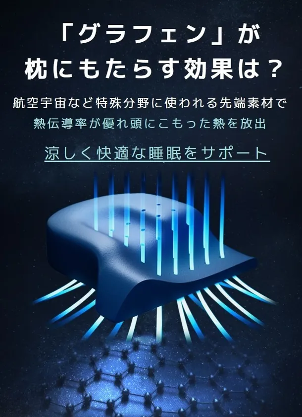 グラフェンとは、航空宇宙など特殊分野に使われる、ノーベル物理学賞も受賞した先端素材です。熱伝導が世界で最も良く耐久性にも優れているため“奇跡の新素材”とも言われています( https://www.nobelprize.org/prizes/physics/2010/summary/ )。グラフェンの枕で頭にこもる熱を迅速に取り除き、自然に温度を調節するため、一晩中涼しく快適な睡眠をサポートします。