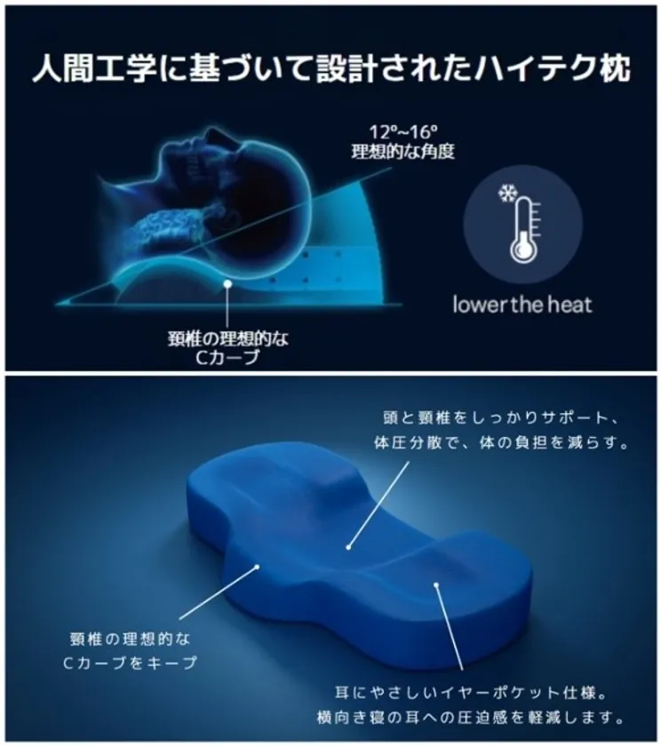 「Monapillow」は人間工学に基づいて設計されており、頭と頸椎をしっかりサポート。体圧分散で、最も負担の少ない姿勢で睡眠をとることができます。500回以上テストを行い、頸椎の理想的なCカーブをキープ。大きい頭の負担を減らすと血流もよくなるので頭に熱もこもりにくくなります。イヤーポケットもついており、横向き寝の耳への圧迫感を軽減。「Monapillow」は仰向けでも横向きでも安眠をサポートします。