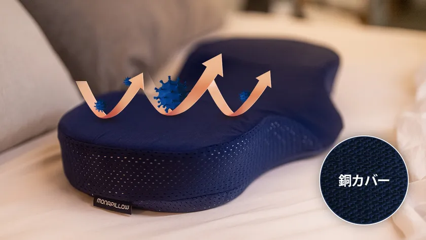「Monapillow」の枕カバーには12%の銅が入っています。銅の超抗菌性能は、日本銅センターでも科学的に実証されています。( http://www.jcda.or.jp/feature/tabid/88/Default.aspx )。独自の抗菌・防臭効果があり、カバーだけでも細菌やウイルスと戦い、枕を常に衛生的に保ちます。