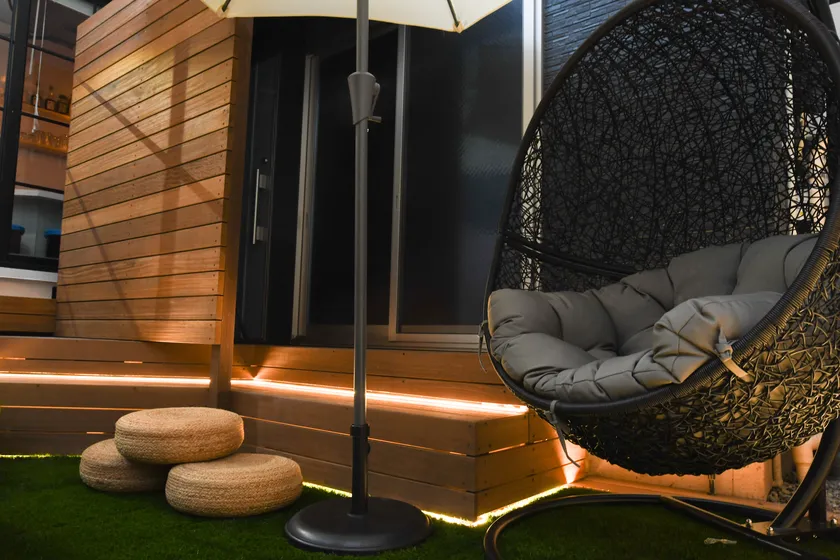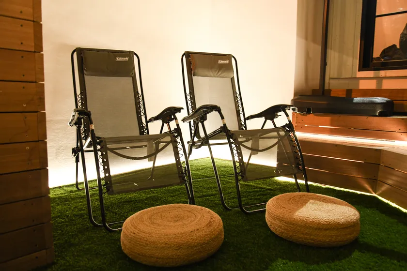 外気浴スペースも完備し、定番のインフィニティチェアの他、浮遊感を体験できるハンギングチェアや防水カバーのビーズソファ、マインドフルネス用の座椅子など、お客様のニーズに合わせたととのい場をご用意しております。