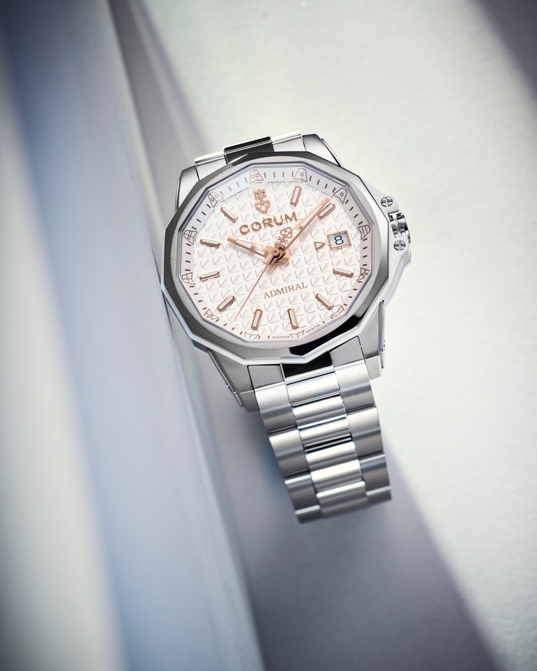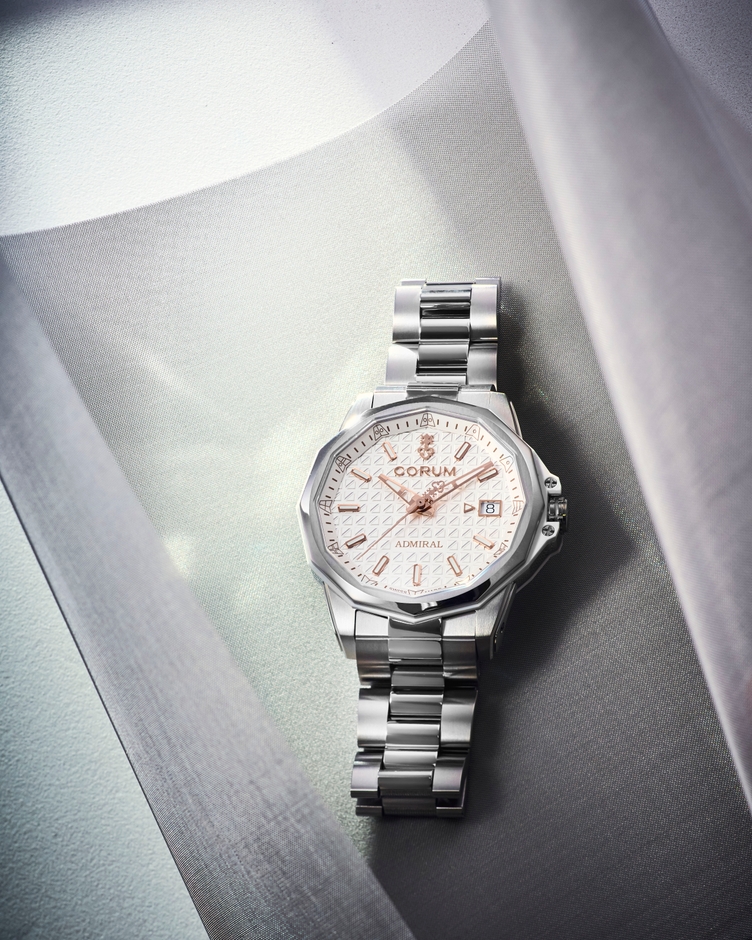 ヨットのナットをイメージした12角形のベゼルと、船舶間の通信で使われる国際信号旗をモチーフにしたアワーインデックスの、アイコニックなデザインコードを持つ『アドミラル』は、その唯一無二のデザインが世界中で高く評価されています。