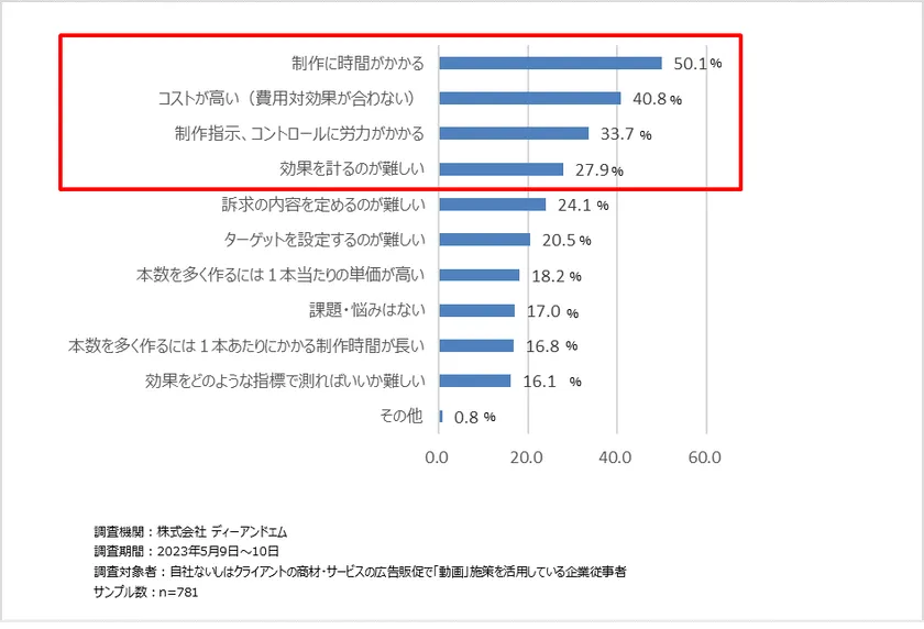 自社やクライアントの商材・サービスの広告販促に動画コンテンツを利用している企業従事者に悩みを聞いたところ、制作に時間がかかる(50.1%)、コストが高い(40.8%)、制作指示、コントロールに労力がかかる(33.7%)という結果でした。<図1>