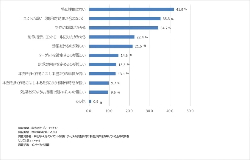 活用していない理由は、「特に理由はない」が4割、次いで、「コストがかかる」(35.3%)、「制作に時間がかかる」(34.2%)と、活用しているマーケッターが課題とする点と同じ内容があげられており、動画コンテンツを積極的に利用する壁があるように見受けられます。<図3>
