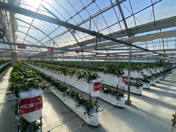 摘む場所と食べる場所を分離した、新しいスタイルのいちご狩り農園。高設ゆりかご栽培・全面床コンクリート張りのため、土汚れを気にせず、ベビーカーや車いすの方にも安心してご利用いただけます。