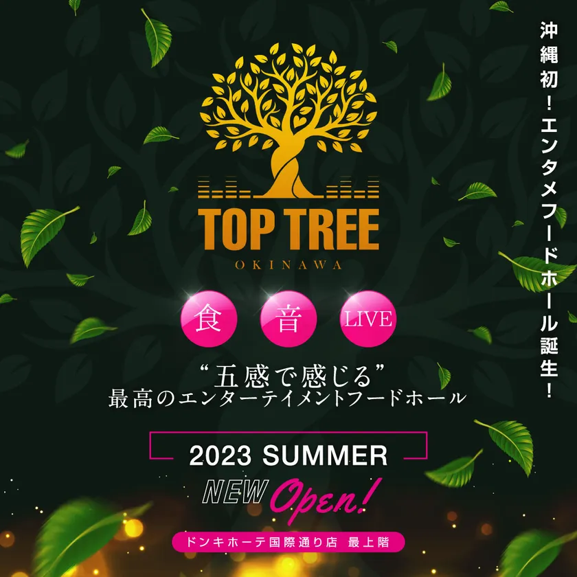 沖縄県那覇市国際通りのランドマーク「ドン・キホーテ国際通り店」最上階に、今夏オープン予定の、食と音楽、エンターテイメントを融合したエンターテイメントフードホール「SKY GARDEN “TOP TREE okinawa”(トップツリー)」。
