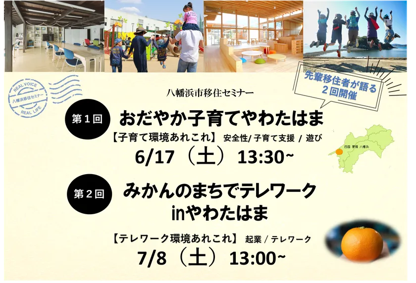 今年度、八幡浜市は先着20名で参加費は無料のオンラインセミナーを2回開催します。第1回目は「リアルな子育て環境」・第2回目は「テレワーク環境」をざっくばらんにご紹介する内容となっております。