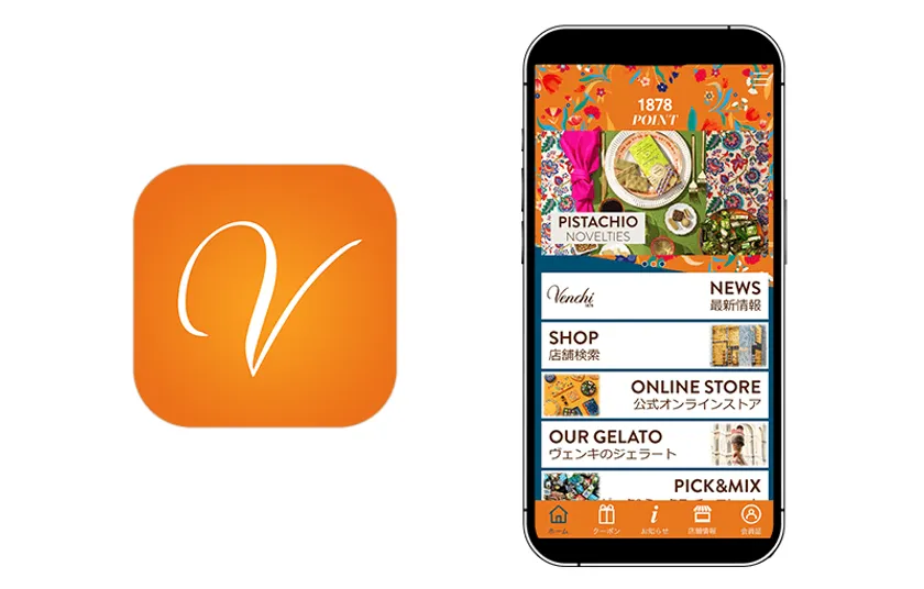 図1 『Venchi(ヴェンキ)公式アプリ』アイコンとトップ画面