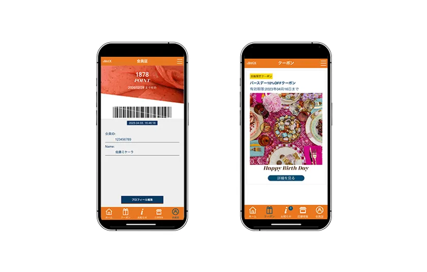 会員限定クーポンを一覧表示。バースデークーポンなどが配信される。