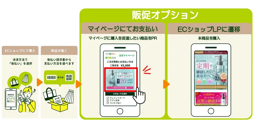 後払い決済サービスを提供する株式会社キャッチボール(本社:東京都品川区、取締役社長:端 郁夫、以下:当社)は、マルチ後払い決済サービス「届いてから払い」において、2023年5月18日より、新サービス「販促オプション」の提供を開始いたします。「販促オプション」は、決済画面にバナー広告を表示できるサービスで、EC・通販事業者さまのさらなる売上が期待できます。