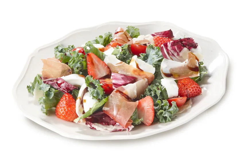 甘酸っぱい苺とクリーミーなモッツァレラチーズのコクをプラスしたシャキシャキケールサラダ。