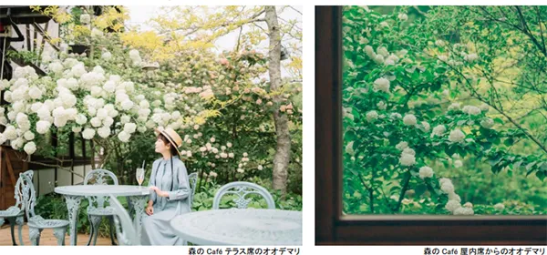 オオデマリは、併設の「森のCafe(※1)」のテラス席や屋内席から鑑賞できます。特に屋内席から望むオオデマリは、窓枠を額縁として絵画のように見ることができます。