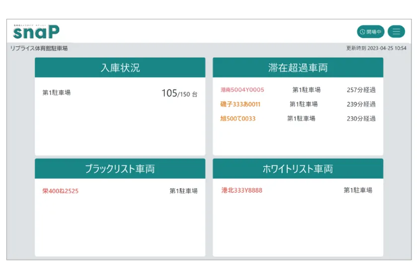入庫状況のほか、あらかじめ設定した滞在可能時間を超過した車両やブラックリストのナンバー、ホワイトリストのナンバーに該当する車両も表示されます。