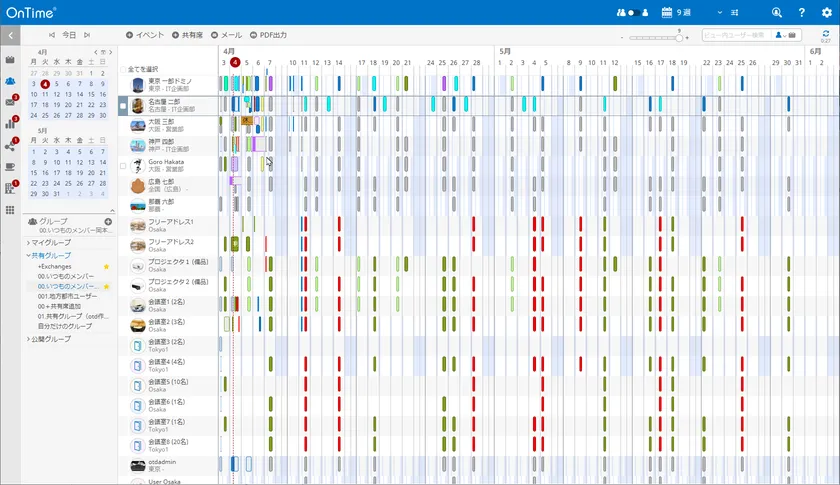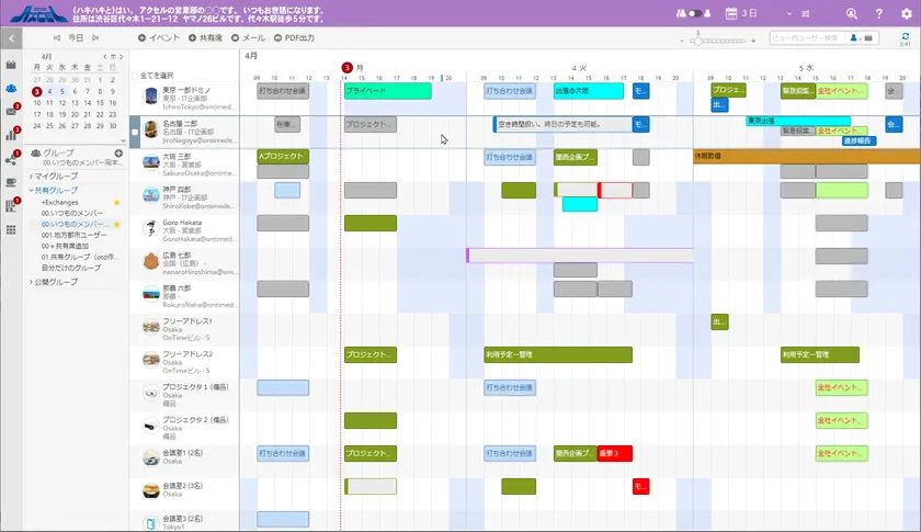メインビューのグループビューでは横スケールで月と日の表示段を別に設け月の区切りをわかりやすくしました。個人ビューでは、日表示ではグループビューと同様左サイドに月と日の表示を分離、週表示では月区切りの境界線もわかりやすくしました。