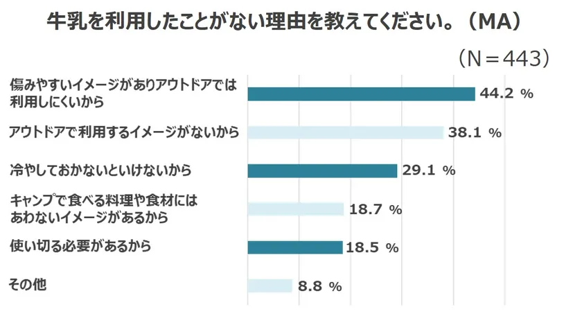 今回の調査でキャンプ場・バーベキュー場などアウトドアシーンで牛乳を飲んだり料理に利用した経験があるかを聞いたところ、88.6%の方が「ない」と回答したそうです。「アウトドアで利用するイメージがない」といった理由や「傷みやすい」、「冷やしておかないといけない」という理由が多いようです。確かに通常の牛乳は10℃以下の場所で保管する必要があるため、長時間の持ち運びには適していませんが、常温保存が可能なロングライフ紙パックであれば、夏のキャンプといったアウトドアであっても安心安全に持ち運ぶことができます。