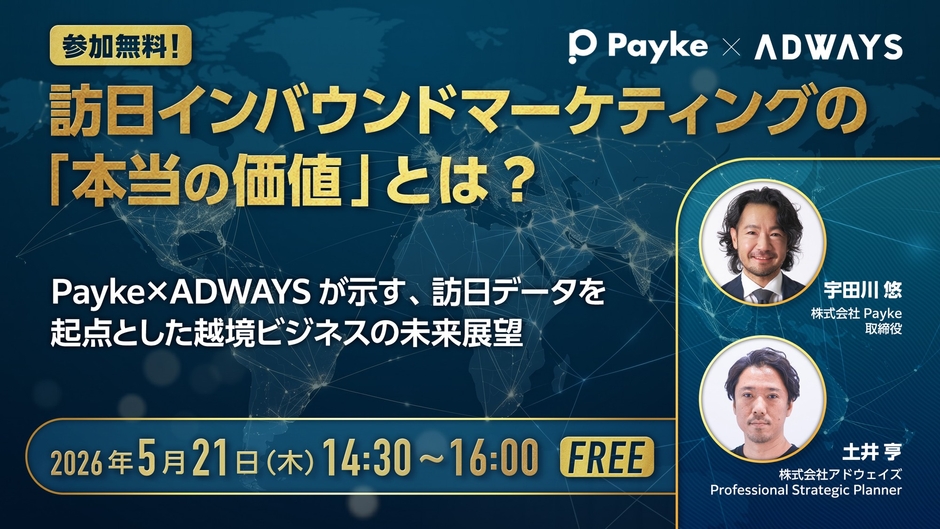 【オンライン開催 2026.5.21】『訪日インバウンドマーケティングの「本当の価値」とは?〜Payke×ADWAYSが示す、訪日データを起点とした越境ビジネスの未来展望〜』をアドウェイズが共催/登壇