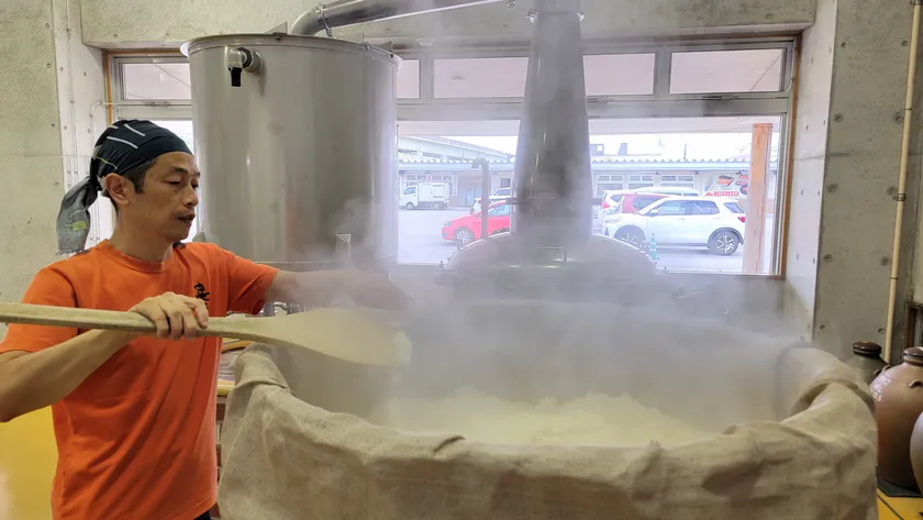 「月の蒸溜所」甑(こしき)で作業する井上杜氏と地釜常圧蒸溜機