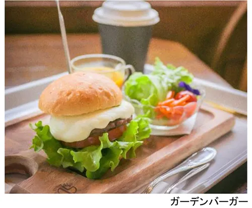 「六甲山ボタニカルフェア」期間限定、ハーブをたっぷり使用したオリジナルメニュー「ガーデンバーガー」を販売しています。テラス席で自然を感じながらのランチタイムにぴったりのメニューです。