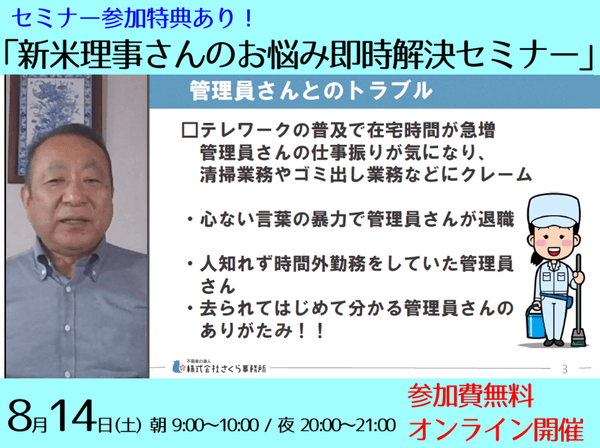 【8/14(土)新米理事セミナー開催】コロナ禍で起きる新たなトラブル5大要因を一網打尽!