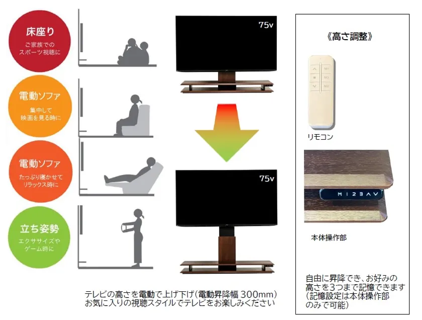 リモコン操作でテレビを自由に昇降(電動昇降幅300mm)でき、高さを3つまで記憶できるので、瞬時にお気に入りの位置に設定することができます。また、最近注目されている電動ソファと併せてお使いいただければ、より一層快適にテレビをご視聴いただけます。