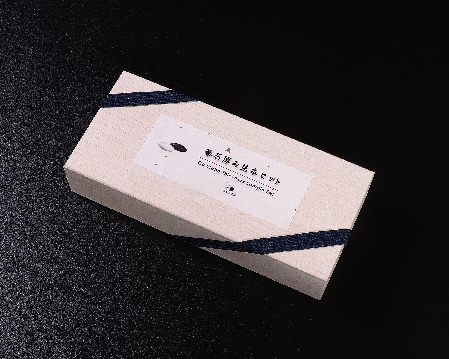 また、はまぐり碁石のサイズ碁石の厚みは全部で20種類以上もありますが、購入を検討しているお客様から「どのサイズが良いか分からない」ということで、ご購入前に厚みの違いが分かるサンプルをお送りして確認いただくことが、これまでも多くありました。そこで、人気のサイズである7種類の厚みの碁石を中心に薄い碁石から厚い碁石まで、白黒それぞれ1粒つずつ木箱に入れ、14粒をセットにした「碁石厚み見本セット」を設計しました。