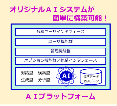 オリジナルのAIシステムを構築、導入したい場合、ITベンダーに依頼するケースが多いのですが、ITベンダーの多くが、上記(1)の状態につき、全て個別開発するため、膨大なコストの上、想定した品質にならないリスクも避けられません。AIプラットフォームを用いて、オリジナルAIシステムを構築すれば、難しく重要な開発部分はAIプラットフォームにて提供されるので、低コスト、低リスク、短期間での構築が可能になります。