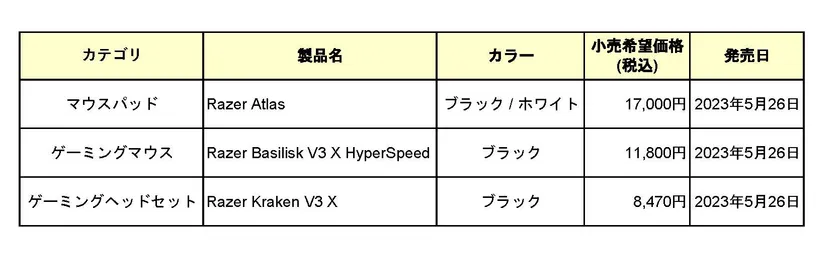 その他、自分好みのカスタマイズが可能でより快適なプレイを実現するワイヤレスゲーミングマウス「Razer Basilisk V3 X HyperSpeed」とデザインが新しくなったゲーミングヘッドセット「Razer Kraken V3 X(アップグレードモデル)」も同日の5月26日(金)に販売開始となります。