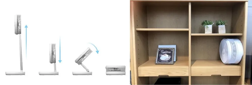 「オリヒメ」は、折り畳むことができ、持ち運びや収納時には付属の専用バッグに入れてコンパクトに。リビング扇風機としての使い方はもちろん、ヘッドを真上に向けサーキュレーターのように空気の循環用として、また、高さを調整して卓上扇風機として、様々な用途でお使いいただけます。