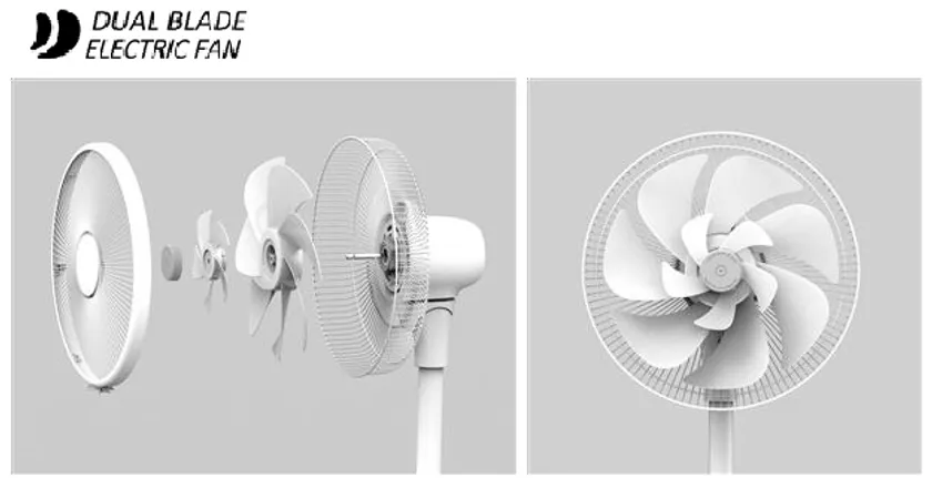RIAIRシリーズ扇風機のデュアルブレード(二重構造羽根)搭載モデルは、大きな羽根と小さな羽根の二重構造により、より自然に近いなめらかな風を優しく遠くまで届けます。