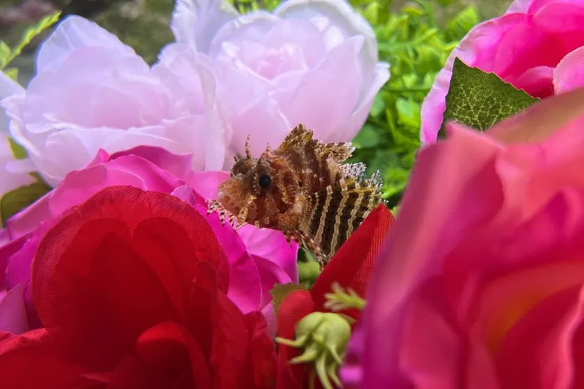 ミノカサゴの仲間で、全体的にふさふさしたヒレが特徴的です。バラのとげのように尖った背ビレの棘には強い毒があります。