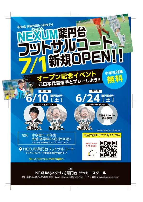 株式会社NEXUMは、千葉県船橋市薬園台に新たなスポーツ施設「NEXUM薬円台フットサルコート」を2023年7月1日(土)にオープンし「NEXUM薬円台サッカースクール」を開校いたします。6月10日(土)、6月24(土)には、元日本代表がスペシャルゲストとして参加する開校を記念したオープンイベント(協賛:株式会社オカムラホーム)を開催いたします。