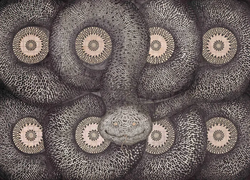 「宇宙蛇」2020 墨、透明水彩、キャンバス、アクリル、ペン、龍神水、金泥、あかし紙、吉祥麻紙 460×640cm (C)KANEKO Tomiyuki Courtesy of Mizuma Art Gallery