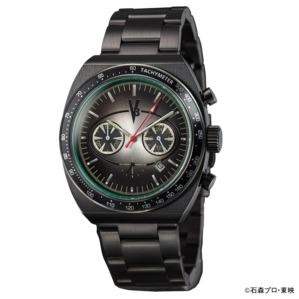 主人公・風見志郎の革ジャンを想起させる大人の黒で仕上げたクロノグラフモデル。