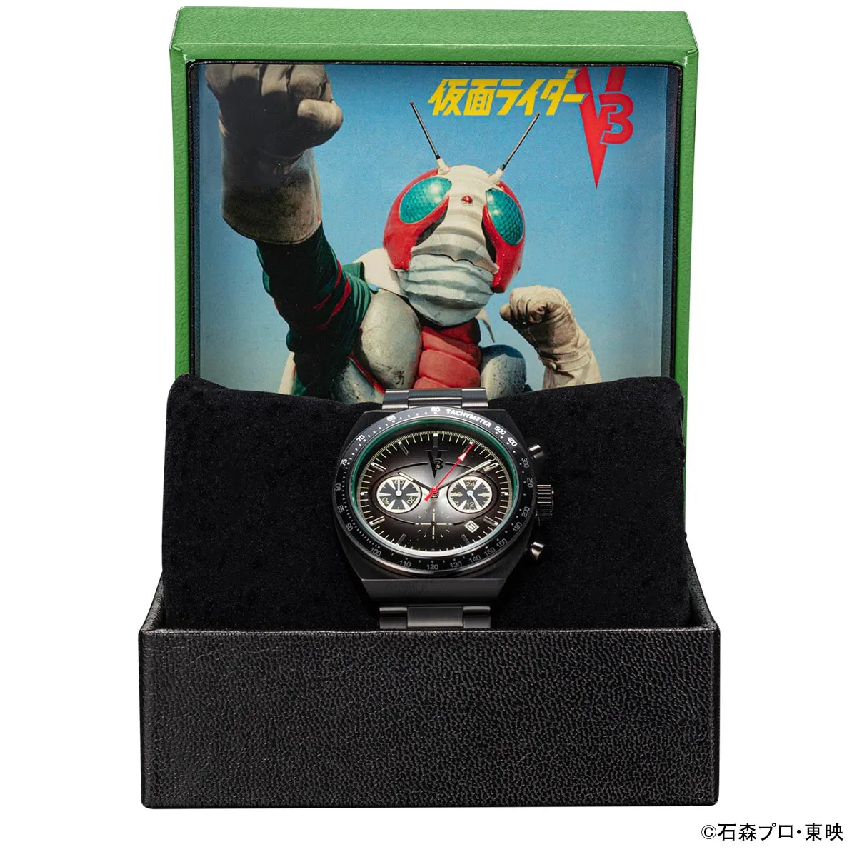 腕時計は、仮面ライダーV3の50周年記念ロゴの箔押しが施された特製ボックスに収めてお届け。