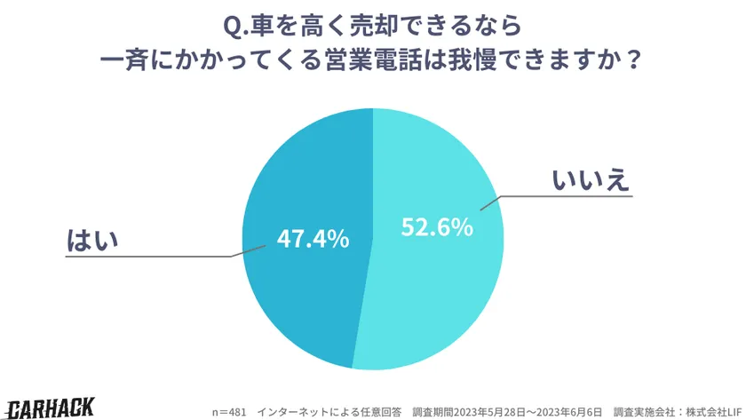 WEBメディア運営やWEB制作事業を行う株式会社LIF(所在地:奈良県香芝市、代表:堀内 秀磨)が運営する車買取・査定の情報メディア『carhack(自動車の知恵・購入・売却ノウハウの全て)』( https://carhack.jp/ )は、車一括査定サービスの利用者481人を対象に「車一括査定サービスのしつこい営業電話に関するアンケート調査」を実施しました。
