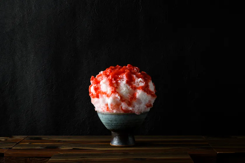 果実シロップは、苺の王様「博多あまおう」を100%使用。素材の味をそのまま楽しめる苺かき氷です。
