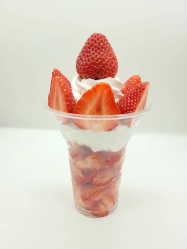 あまおう生産農家が作るパフェ。下にフローズンあまおうのスライス、その上にあまおうソースとホイップクリーム。トップにあまおうを盛り付けました。