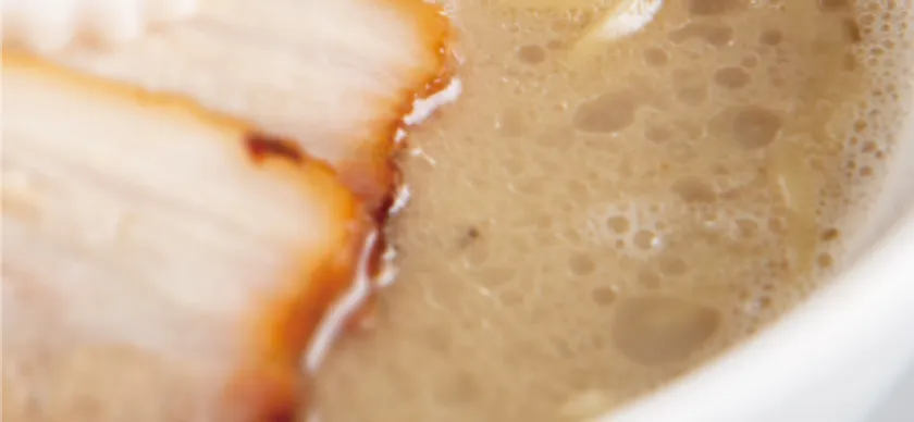 豚骨を100%使用し20時間かけて作り上げます。タレは2種類の醤油に和だしを加え、香味野菜をオリーブオイルでグリルしたものを漬け込みます。臭みがなくクリーミーな味わいが愉しめます。