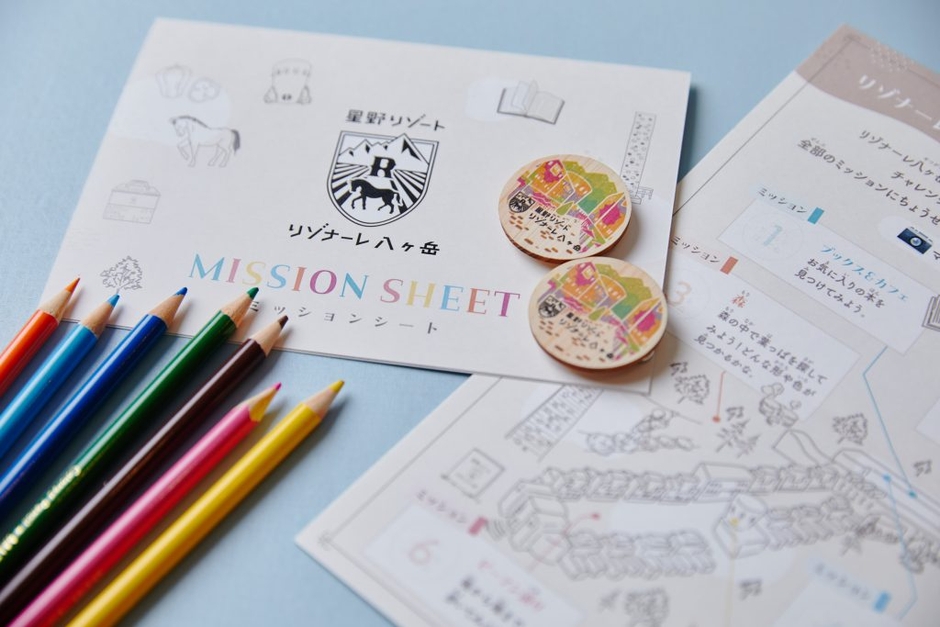 ウェブサイトのクイズに全問正解すると「ヒミツのあいことば」が手に入ります。ホテル到着後、「ヒミツのあいことば」を伝えると、ミッションシートがもらえます。ミッションは、ホテル内に点在するポイントを巡りながら写真撮影をしたりクイズに答えたりと、子どもが意欲的に楽しめる内容です。ミッションを達成すると、リゾナーレ八ヶ岳オリジナルの記念バッジがもらえます。